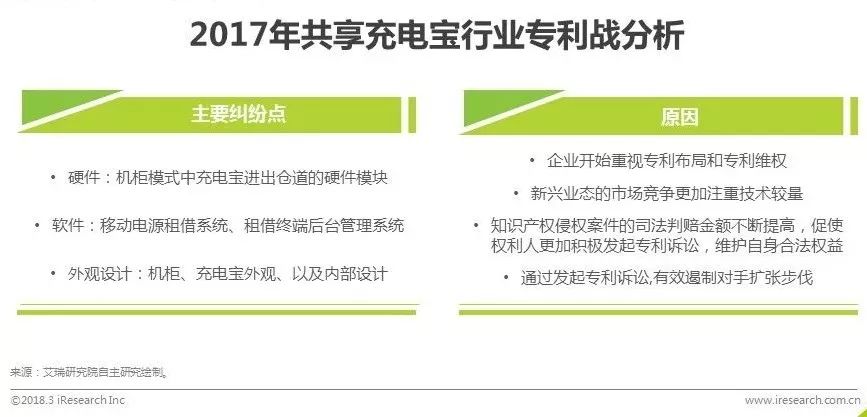 截至2017年8月,关于共享充电宝的专利纠纷累计达45起。其中来电起诉街电6项专利侵权、友电5项专利侵权、租电2项专利侵权,在北京、深圳两地共涉及36项案件,累计赔偿金额超过6600万元。街电起诉来电共计3项专利,涉及3项案件,涉案金额300万元。主要纠纷点集中在机柜模式中充电宝进出仓道的硬件模块、租借系统、后台管理系统以及外观设计等。从良性的技术竞争角度来看,专利战可以促使企业积极进行技术创新,特别是在迭代迅速的TMT行业。从商业的角度来说,专利诉讼可以造成新闻效应。但由于新兴行业充满不确定性,仅仅依靠专利遏制竞争对手难度较大,且可能会对自身的发展造成阻力,行业最终的竞争力还是要回归到运营上来。