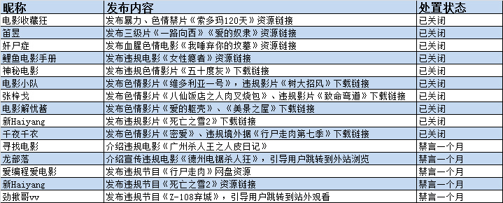 新浪微博表示,根据《网络安全法》及相关法律法规,对发布违禁节目和影片的账号进行了集中清查,并予以关闭。