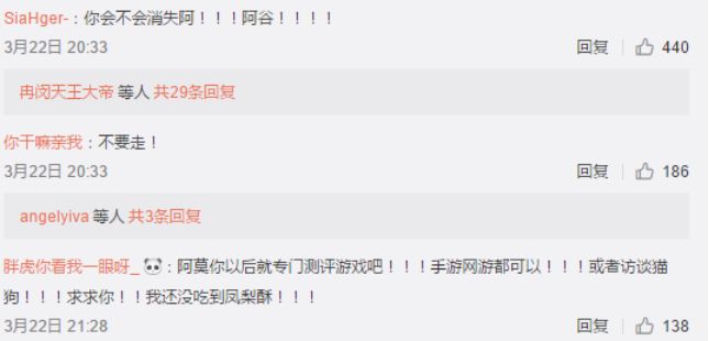 以“x分钟看完x”而闻名江湖的微博大V @谷阿莫同样并未有所表示,依旧不动声色地在“4分钟看完2013怪兽侵地球的电影《环太平洋1》”的同时推广自家的凤梨酥。相比谷阿莫的淡定,粉丝们却格外着急 “你会不会消失”、“不要走”。