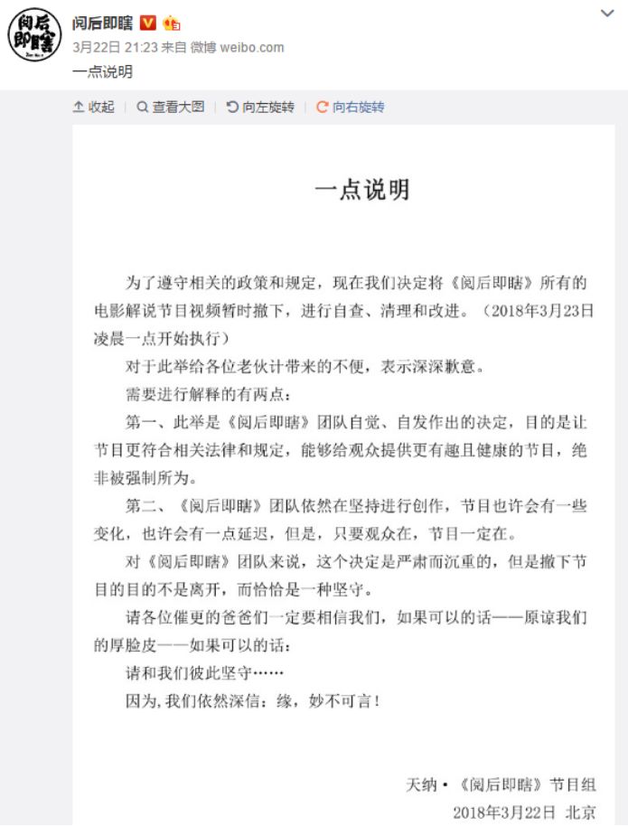 而另一方,B站知名UP主“阅后即瞎”却迅速做出反应。该团队于22日晚在官方微博和微信公众号上同步发表《一点说明》进行发声,宣布从3月23日凌晨一点起暂时撤下所有电影解说节目视频,进行自查、清理和改进的同时,也表示此举绝非被强制所为,而是为了节目更健康、更合法合规的自发行为。