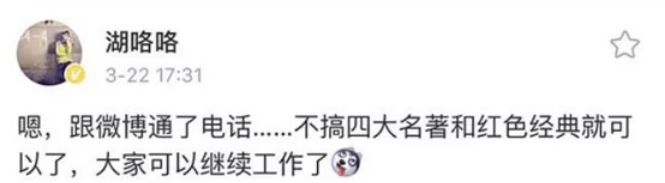 成立八年的“胥渡吧”,以及 以突破次元壁的《芈月传》等创意恶搞配音起家的“淮秀帮”,双方并未发声,但据网友称,“淮秀帮”创始人@湖咯咯曾于22日下午发微博表示“不搞四大名著和红色经典就可以了。”但随即又删除了该微博,可见并非风平浪静。