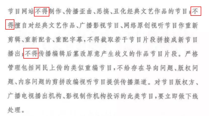 2、不得擅自对经典文艺作品、广播影视节目、网络原创视听节目作重新剪辑、配音、配字幕,以及截取片段拼接成新节目;