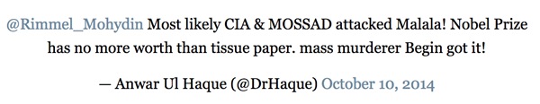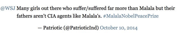 只可惜,在巴基斯坦的社交网络上,不开心的声音几乎和开心的声音一样响。有很多评论认为马拉拉是美国、印度、或者是以色列情报机构贬低巴基斯坦的阴谋。