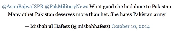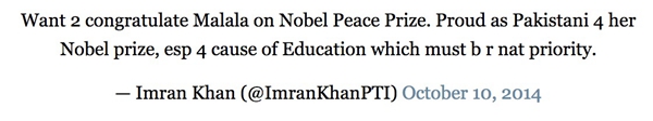 “要恭喜马拉拉获得诺贝尔和平奖。作为一个巴基斯坦人我感到骄傲,教育永远是最重要的事。”