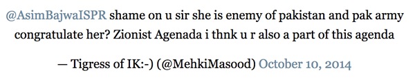 “真是你的耻辱。她是巴基斯坦的敌人,巴基斯坦军队还祝贺她?复国运动也是阴谋的一部分。”