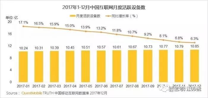从大环境来看,以BATJ为代表的新经济公司大多来自互联网。研究数据显示,2017年中国移动互联网月度活跃设备总数稳定在10亿以上,从2017年1月的10.24亿到12月的10.85亿,增长非常缓慢;同比增长率也呈逐月递减的趋势,从而再次验证人口红利殆尽、移动互联网用户增长面临巨大考验的现状。