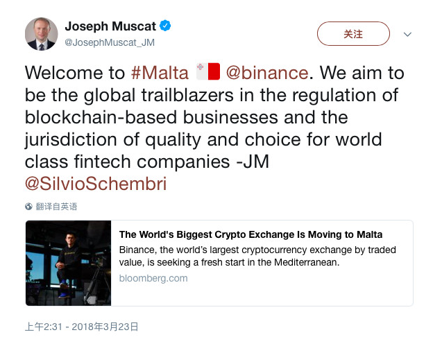 就在前途一片灰暗之际,马耳他总理Joseph Muscat向币安网伸出“橄榄枝”。3月23日,Joseph Muscat在Twitter称“欢迎币安来马耳他,将为全球一流金融公司打造最适宜的栖息地”。随后,赵长鹏转推该文,并在3月23日接受彭博社采访时透露,提到币安计划在马耳他设立办公室,也会开放虚拟货币对法币的直接交易。
