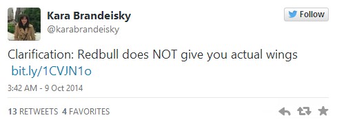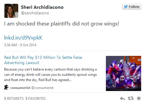 因为,红牛无法实现广告语中给消费者的承诺,即“红牛给你双翅膀”,最终同意向消费者支付1300万美元的赔偿金,用以补偿不实广告语对消费者带来的伤害。