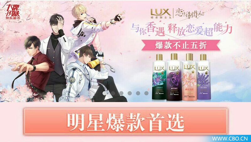 今年2月,联合利华旗下品牌LUX力士也宣布同《恋与制作人》展开合作。根据游戏中四大男主的个人特色,以霸道总裁李泽言入股力士、超能警察白起寻找神秘香氛足迹、天才科学家许墨化身调香师、国际巨星周棋洛代言力士香氛沐浴露为主题进行跨界合作。分别对应熏衣馨舞、恣情晚香、幽莲魅肤、桃花浅析香四种香型,并推出香恋语音浴露礼盒。