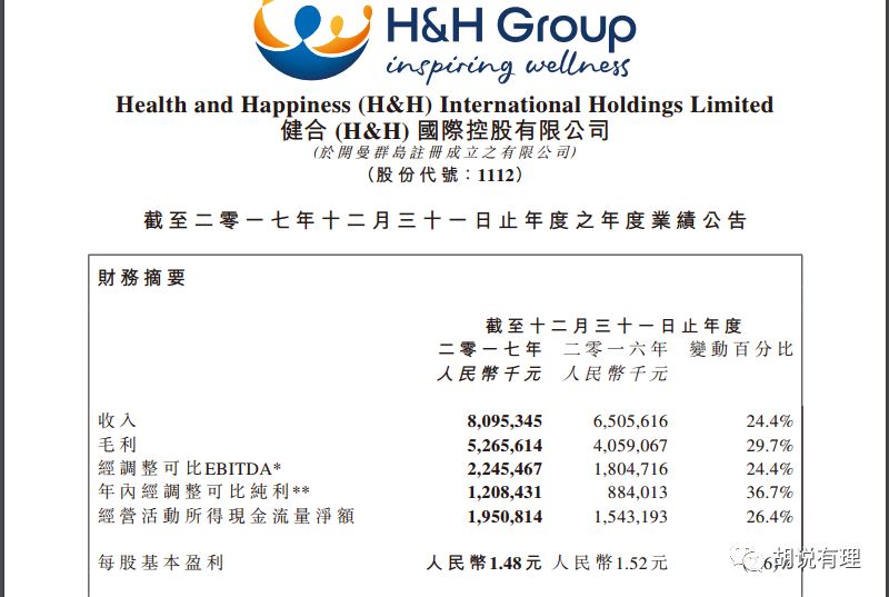 去年由合生元更名为健合集团后,首份完整年度业绩报告公布。3月25日晚,健合(H&H)国际控股有限公司(以下简称“健合集团”)发布2017年财报显示,2017年健合集团销售收入达到80.95亿元,比上年同比增长24.4%,经过调整可比纯利(Adjusted Net Profit)12.08亿元,同比增长36.7%。