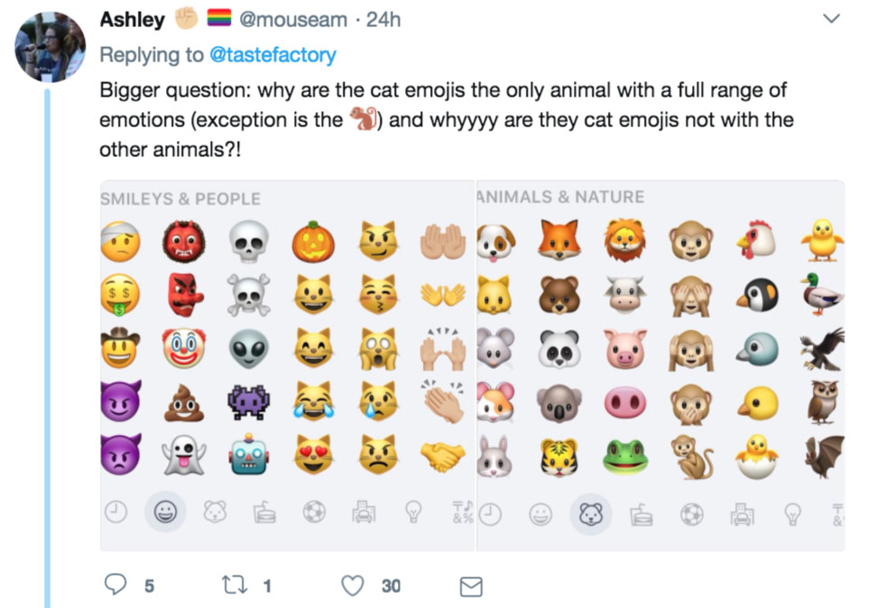 更严肃的问题是:为什么只有猫的emoji是有一系列表情的?还有为什么猫脸表情不跟其他动物在一起????