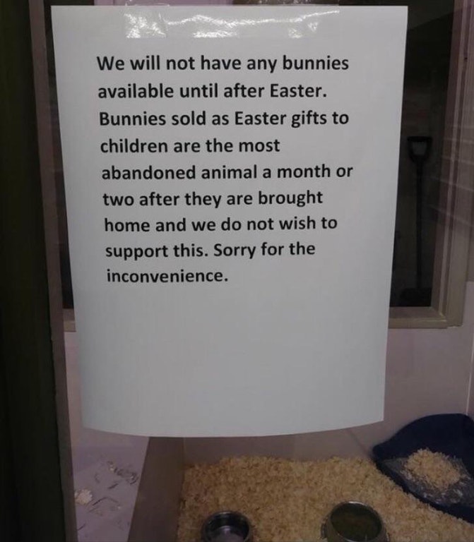 我们在复活节结束前不提供兔子。在复活节期间作为礼物送给孩子们的兔子被弃养率是最高的。我们不打算成为共犯。给您造成不便,敬请谅解。