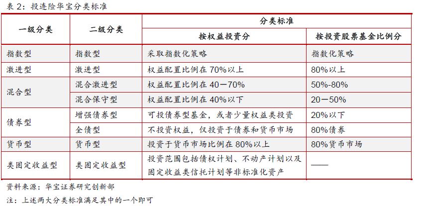根据不同的风险收益结构,华宝证券将国内现有的投连险品种进行了两级分类。其中,一级分类有6类,分别是指数型、激进型、混合型、债券型和货币型,以及类固定收益类。二级分类共有8类,将一级分类中的混合型细分为混合激进型和混合保守型,将债券型细分为增强债券型和全债型。