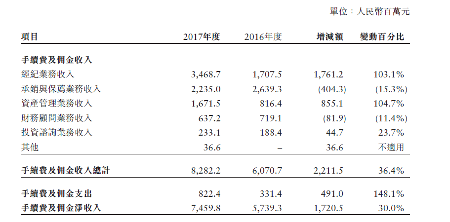 从营收规模上看,中金传统的投资银行业务依然是公司赚钱的王牌,但因2017年国内债券融资业务相对减少,导致承销与保荐业务出现下滑。