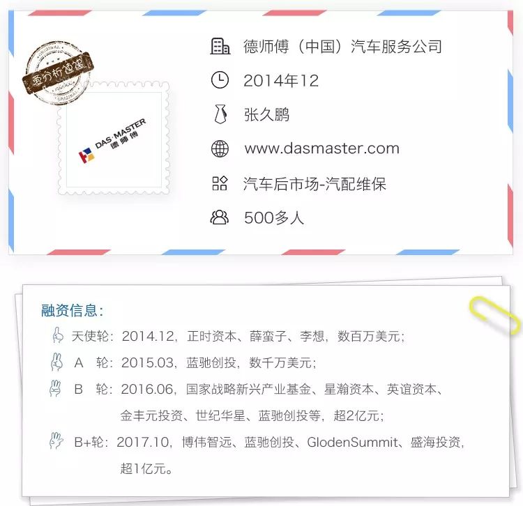2014年底成立的德师傅,通过直营和托管模式切入汽修行业,靠并购和授权策略改造存量市场,力争提升行业的运营效率。截止当前累计融资超3亿元,线下门店连锁体系600余家,运营成熟的社区店年产能突破200万。