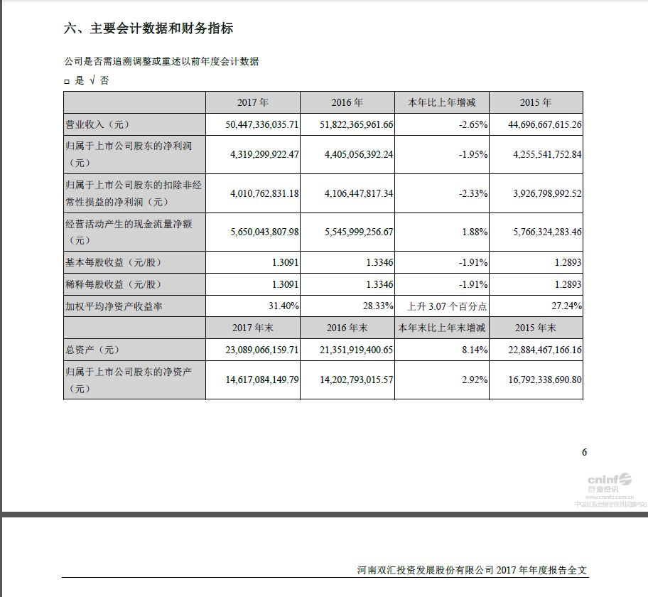 公告显示,2017年,双汇发展实现营业收入约为504.47亿元,和2016年518.22亿元相比,下滑2.65%;归属于上市公司股东的净利润约为43亿元,相较于2016年44亿元,跌幅在2%左右。