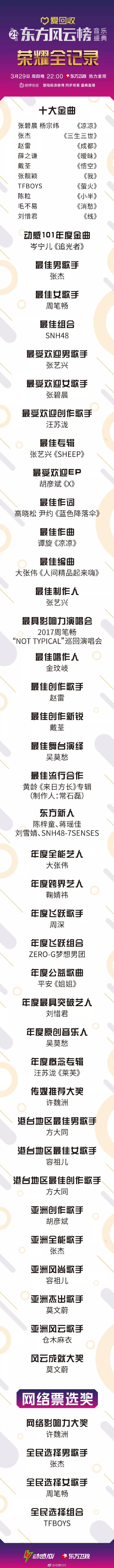 今年《东方风云榜》的盛典现场盘点过去一年华语乐坛表现,并颁出近40个奖项。张杰与周笔畅分别获颁最佳男歌手与最佳女歌手,首登《东方风云榜》音乐盛典舞台的张艺兴获得最受欢迎男歌手,张碧晨获得最受欢迎女歌手。在今年迎来演艺生涯第25个年头的莫文蔚收获“风云成就大奖”。