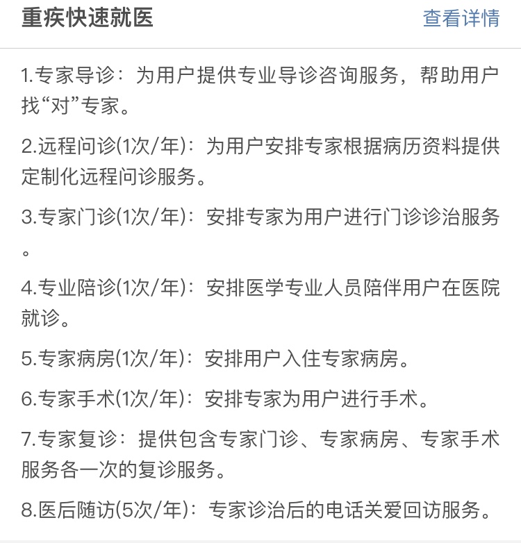 增值服务方面,由人保健康承保的好医保·重疾保障提供安排“三甲医院专家诊疗/手术/床位”的绿色就医通道,而由泰康在线承保的微医保·重疾保障明确提供每年一次远程问诊、专家门诊、专家病房、专家手术、专家陪诊服务及每年5次的医后随访等服务。