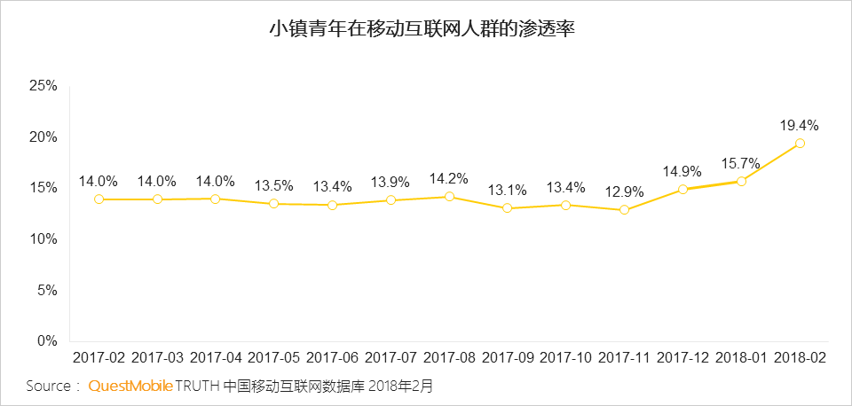 随着移动互联网的进一步普及,用户下沉,小镇青年群体已经成为一股不可小觑的力量,逐渐走向大众视野。据QuestMobile数据显示,2018年2月,小镇青年规模高达2.12亿,渗透率同比增长38.6%。