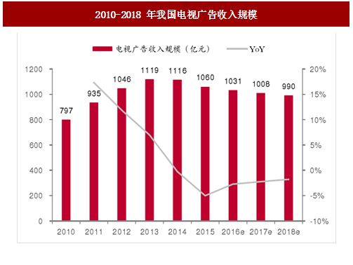 同样是在网综崛起的2014年里,电视广告却首次出现了负增长,从2013年的1119亿元下滑至1116亿元,近年来电视广告收入持续下滑,2017全国广播电视广告收入仅1008亿元,电视广告整体行业低迷。