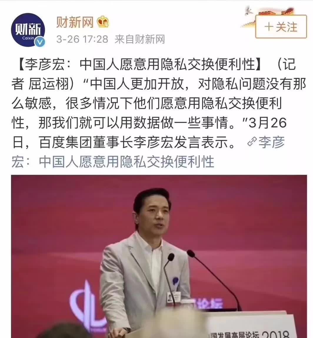 3月26日,李彦宏在中国发展高层论坛上表示中国用户更加开放,对隐私问题没那么敏感,在很多情况下愿意用隐私交换便捷性和效率。如此表达,再加上一些断章取义的传播,引发了轩然大波。显然李彦宏百度的敏感身份,给网友们造成了那种你们看不惯我,又干不掉我的错觉,遭到了口诛笔伐。