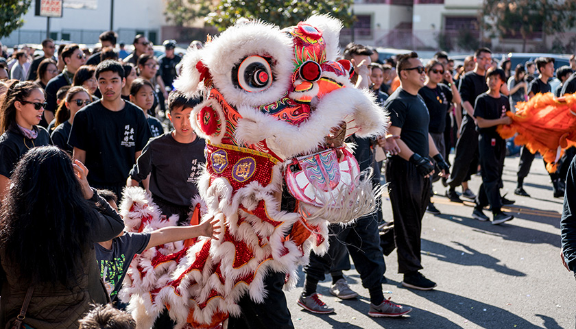 2月17日,美国加州洛杉矶,亚裔社区在洛杉矶华埠主要两大街道举行农历新年的重头戏“金龙大游行”。图片来源:视觉中国