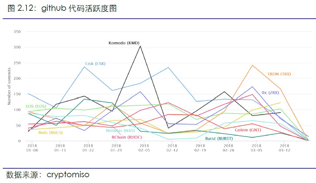 TRX为本周github代码活跃度最高项目,但大部分代码活跃度都有所下降。2018年3月18日至3月24日,github代码中TRX活跃程度最高,达123 commits,环比上周下降46.34%。EOS活跃度其次,为115commits,环比下降12.21%。其余代码除了KMD活跃度有小幅上升,ZRX活跃度持平外,大部分代码的活跃度处于下降阶段。