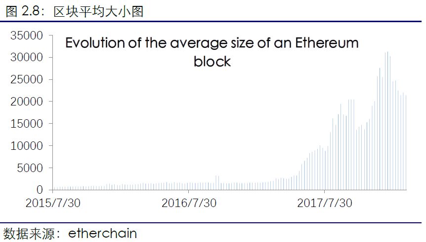 根据etherchain数据计算,以太坊本周每个区块的平均交易次数为111.11次,与上周环比下降1.91%。全网交易区块平均大小为19173.75bytes,与上周环比下降了4.47%,较2015年8月1日最低的575.2bytes上升3233.41%,较2018年1月4日的历史最高值33683.8bytes下跌了43.08%。