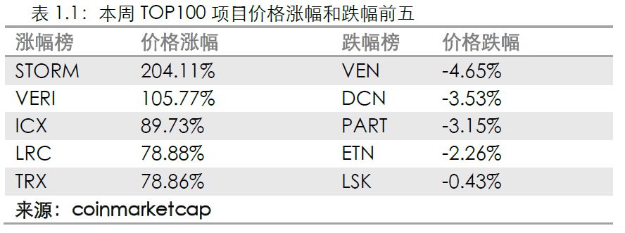 本周市值前100项目中有6个项目日均市值较上周下跌,其中Dentacoin跌幅最大,达3.67%,其次为Particl,跌幅达3.08%,市值排名均下降16位,排名下降最多。