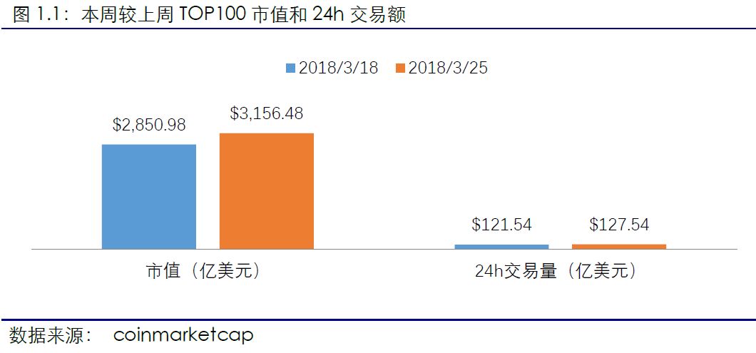 市值前100区块链资产日均市值总体涨幅明显。据coinmarketcap数据,截止2018年3月25日,全球区块链资产市值前100项目总市值为3,156.48亿美元,同比上涨10.72%,涨幅明显。共41个项目较上周市值涨幅超过20%,其中涨幅最高为Storm,达204.11%,市值排名由上周121位上升至本周60位,排名上升最多,24小时交易量较上周增长11481.41%,上涨幅度排名第一。此外,还有Nuls、Metal、Enigma、BitcoinDark以及Storj五项资产本周进入TOP100。3月25日, Bitcoin价格为8,567.85美元,同比上涨 10.97%,Ethereum价格为520.96美元,同比上涨0.19%。