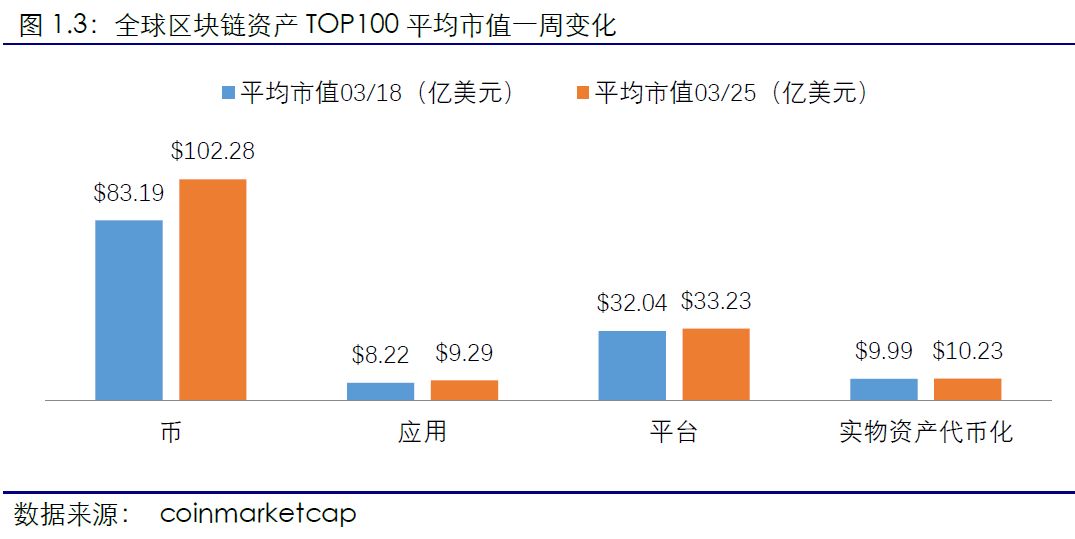 应用类项目市值涨幅最大。截止2018年3月25日,全球区块链资产TOP100项目中,应用类项目总市值较上周增长15.06%,涨幅最大,币类资产和平台类资产总市值较上周市值分别增长10.64%和8.45%。此外,本周币类资产平均市值达102.28亿美元,同比增长22.94%,涨幅最大,其次为应用类项目,平均市值上涨13.01%。实物资产代币化项目平均市值上涨2.35%。