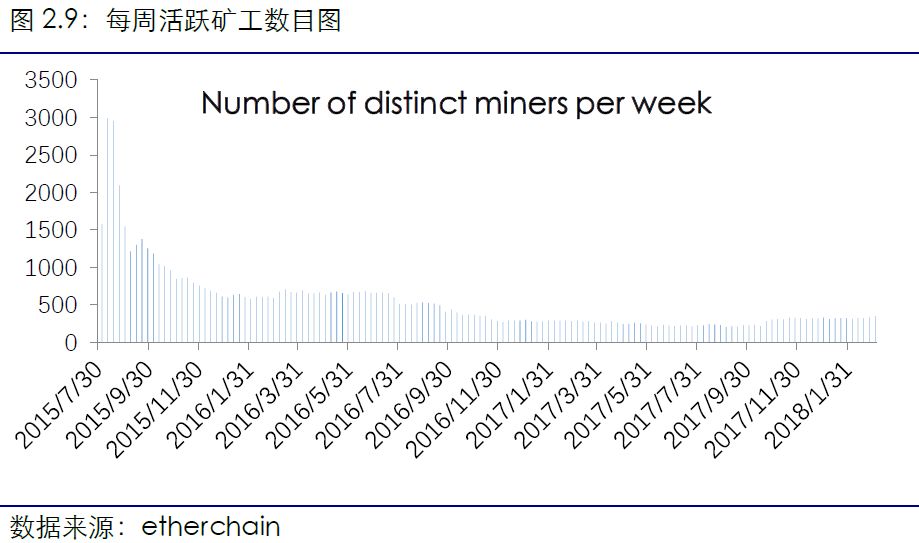 以太坊活跃矿工数目保持稳定增长。2018年3月18日至3月24日,以太坊本周活跃矿工数为363,环比上升0.55%。最近几周,以太坊活跃矿工数目基本保持小幅增长。