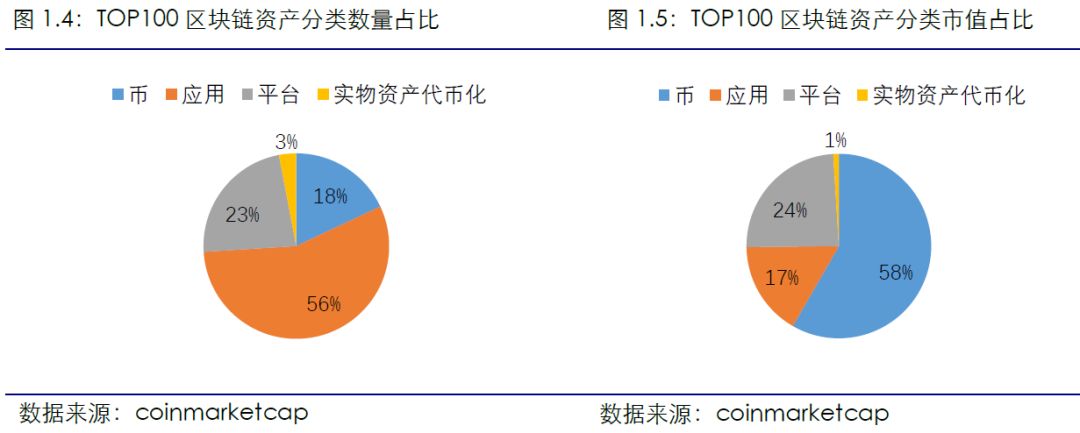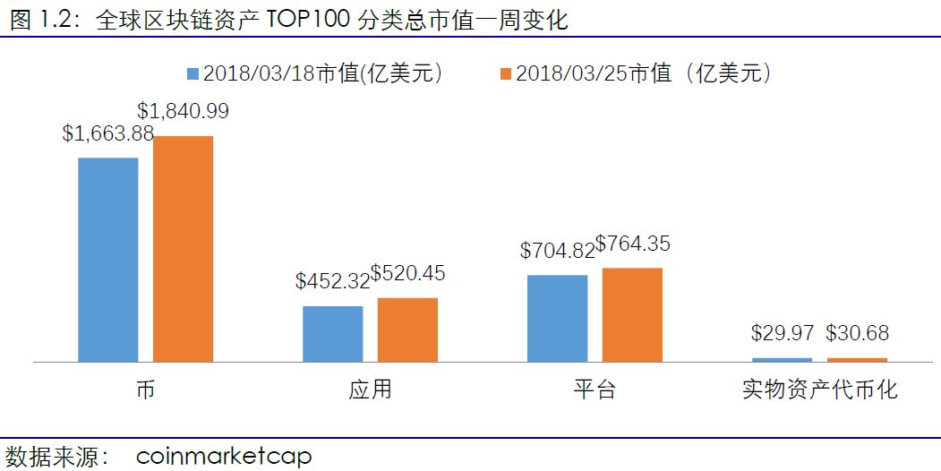 全球区块链资产TOP100项目分类占比稳定。截止2018年3月25日,在市值排名前100的项目中,较上周四类项目数量占比保持平稳,本周币类资产减少2个,应用类、平台类资产各增加一个。市值占比最大仍为币类资产,占比58.32%,保持平稳。