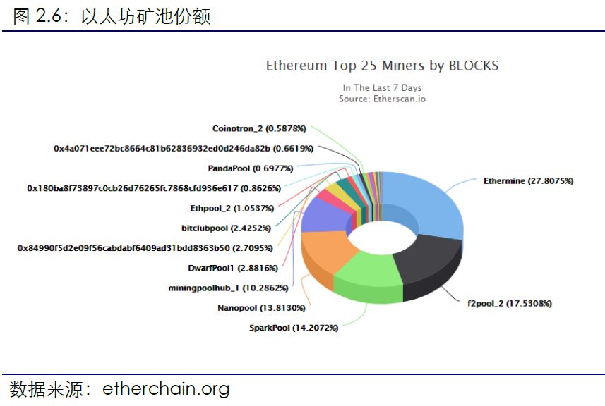 过去一周,以太坊全网出块数据为41852块。其中出块前五的矿池为Ethermine、f2pool_2、SparkPool、Nanopool和miningpoolhub_1,分别出块11638、7337、5946、5781和4305块,占比为27.81%、17.53%、14.21%、13.81%和10.29%。