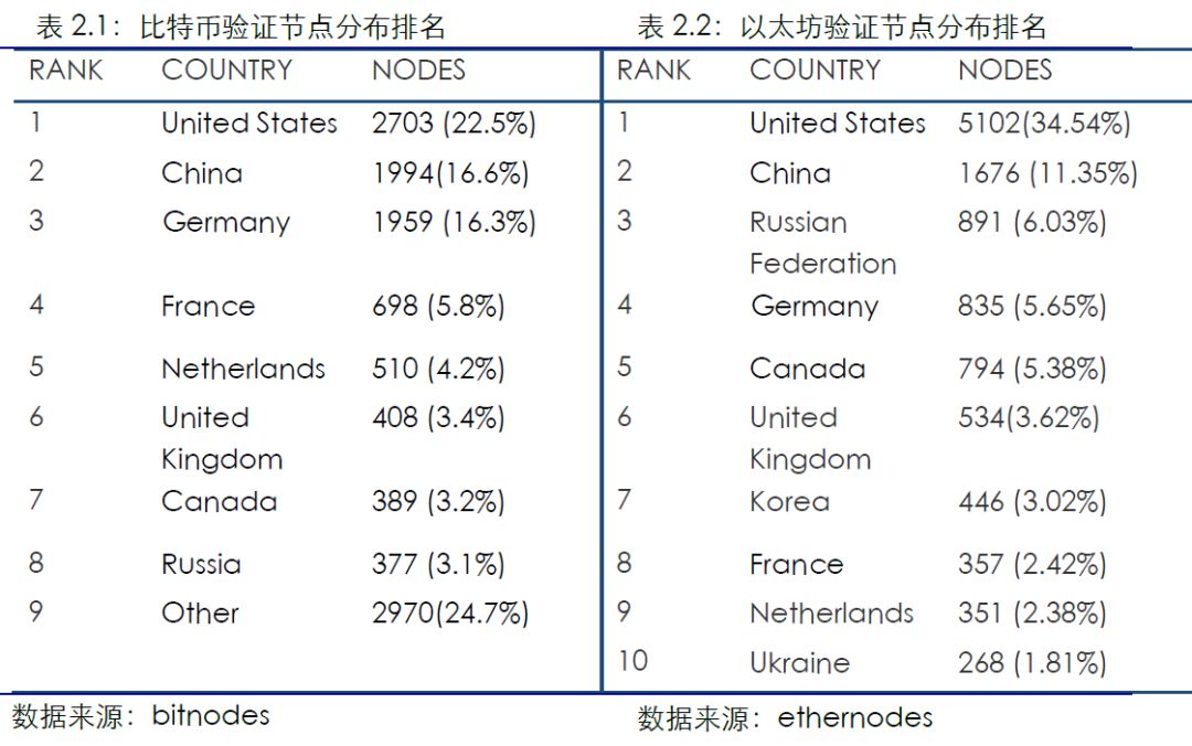 比特币、以太坊验证节点数双双下降。截止2018年3月 24日,比特币验证节点达到12008个,与上周环比下降0.83%,其中美国有2703个节点,占比22.5%,中国有1994个节点占比16.6%,德国有1959个节点,占比16.3%。