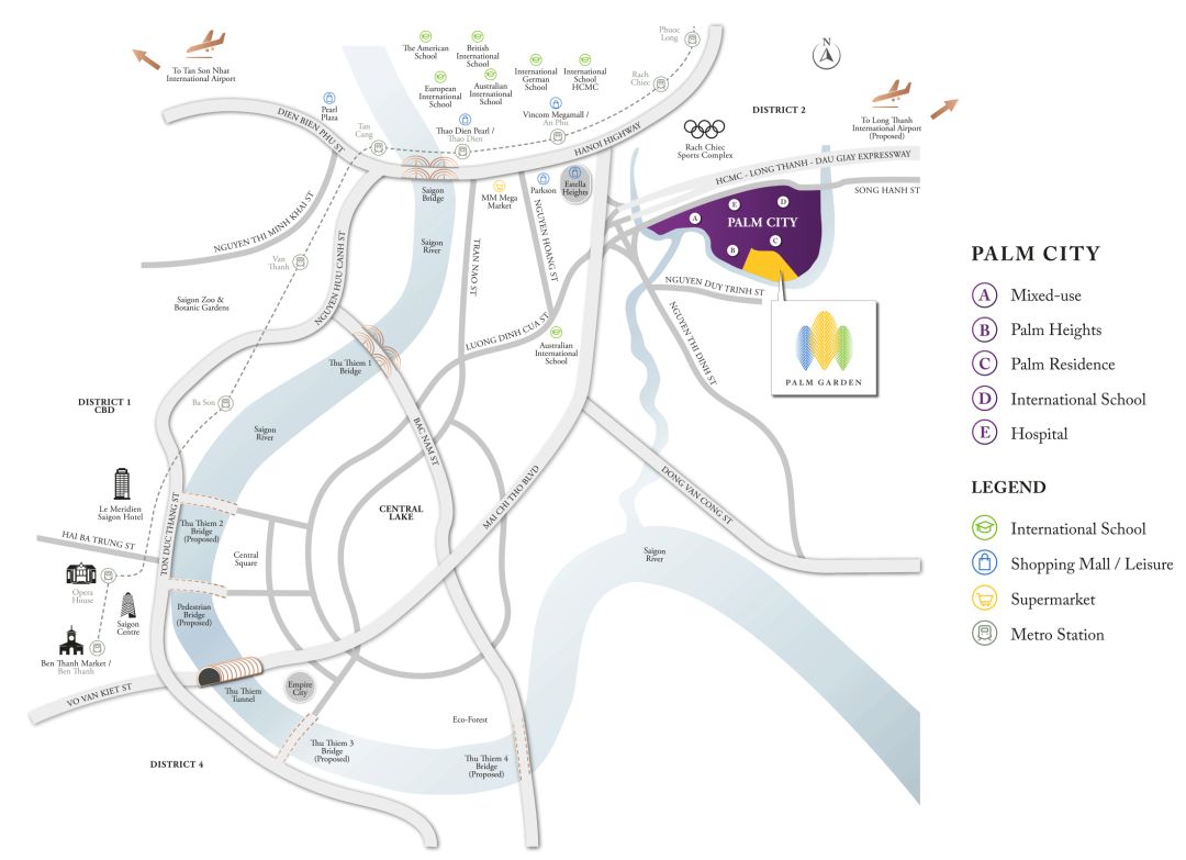 ●位于Giong Ong To和Muong Kinh Rivers河两岸的胡志明市二郡中心。8公里(15分钟)到达胡志明市CBD。