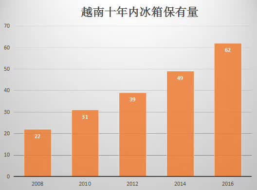 ▲越南十年来冰箱的保有量