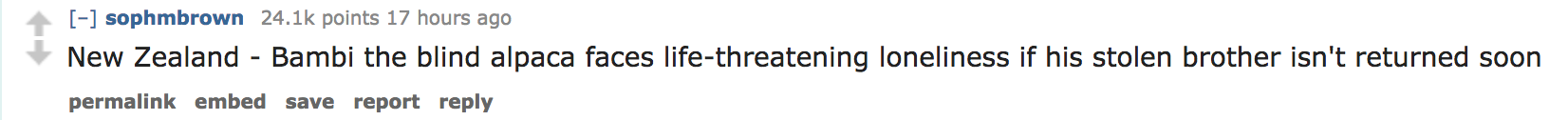 这就是上面提到的那只丢了兄弟的羊驼。在地球的另一端,有人关心着一头羊驼的精神生活,而你在思考晚上吃点什么。世界就是这么神奇。