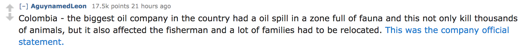 在哥伦比亚,一艘石油公司的油船泄漏,污染了当地动物保护区,不仅导致数千动物死亡,也影响了当地渔民,数千家庭将被疏散。