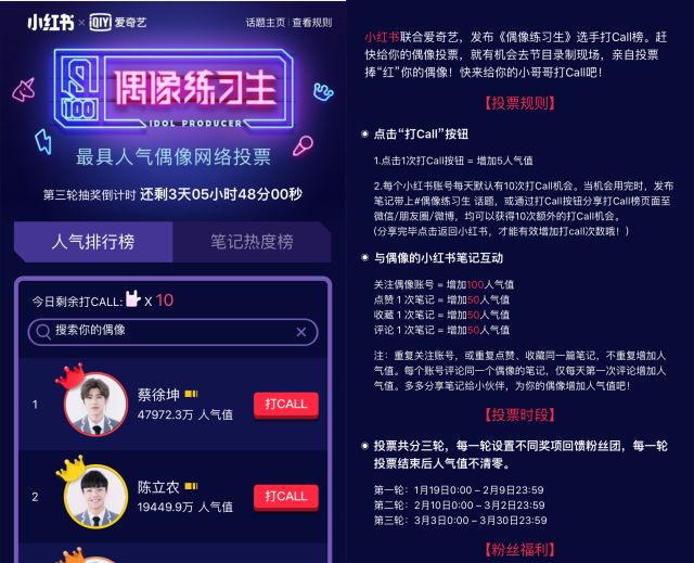 根据这一圈层特点,相较于传统的将广告植入节目内容中,养成类创新了多种绑定粉丝的广告营销方式,也获得了不错的效果。如《偶像练习生》的广告主“小红书”,本是一个以分享美妆、吃穿玩乐的网络社区,前期通过范冰冰、林允等明星入驻分享美妆而收获不少年轻女性用户,而在《偶像练习生》中,小红书转身成为粉丝为练习生“打CALL”的官方投票区域,关注账号、点赞、收藏、评论等行为都能获得人气值为练习生投票,并获得前往录制现场的机会。