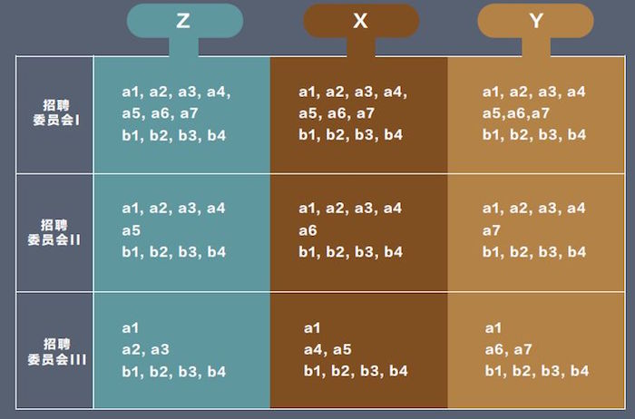 假设A共有7条正面信息(a1, a2, a3, a4, a5, a6, a7),B有4条正面信息(b1, b2, b3, b4),两人均无负面信息。招聘委员会由3个成员(X、Y、Z)组成,为方便起见,公司成立了3个招聘委员会,在委员会开会之前,每人拿到的信息如下图。