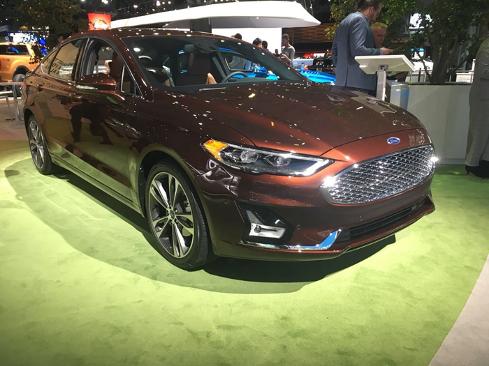 新款福特Fusion在整体造型上延续了此前设计,但在细节上经历了升级和调整。其前进气格栅依旧采用“马丁脸”造型,但设计稍有改变,前雾灯造型也采用了新样式。新车尾部取消了贯穿式镀铬饰条,换装新的LED尾灯,增加了扰流板,并对后保险杠配色有所调整。