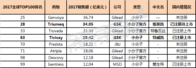 表3 2017全球药品销售额TOP100中HIV治疗领域产品
