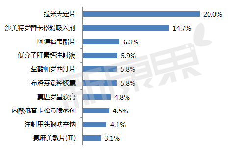 图7 2016年GSK中国销售额TOP10产品及市场份额