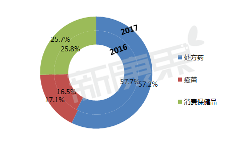 疫苗业务的增速最快,且占比有所提高。2017年GSK实现营业收入301.86亿英镑,增长8%(基于实际汇率,下同)。具体来看,三大业务中,处方药172.8亿英镑,增长7%;疫苗51.6亿英镑,增长12%;消费保健品77.5亿英镑,增长8%。