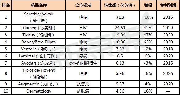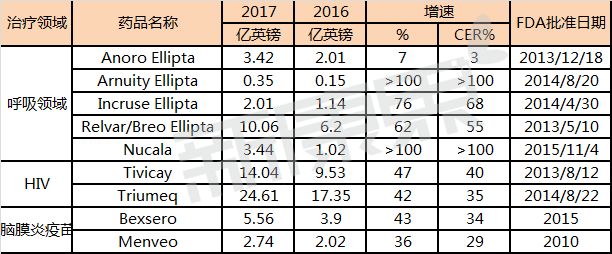 Relvar/Breo Ellipta2013年获FDA批准用于治疗慢性阻塞性肺病(COPD),是GSK应对舒利迭专利悬崖的替代产品,有“二代舒利迭”的称号,但是上市后市场表现平平。2016年Relvar/Breo Ellipta获批新的适应症——用于18岁及以上哮喘(asthma)成人患者,该药不适用于急性支气管痉挛的缓解。作为首个每日一次的吸入性疗法,Relvar/BreoEllipta可用于哮喘(asthma )和慢性阻塞性肺病(COPD)的治疗,和常规疗法相比,能够更有效地减轻患者急性加重症状。新适应症的获批,大幅提振Relvar/Breo Ellipta的销售,2016年销售额同比大涨141%至6.2亿英镑,2017年销售额同比大涨62%至10.06亿英镑。