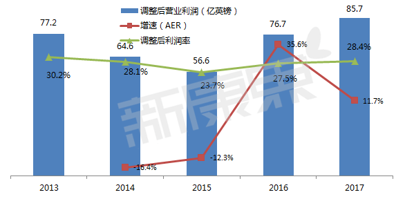盈利能力持续改善。2017年调整后营业利润为85.7亿英镑,利润率较2016年上升0.9个百分点至28.4%。
