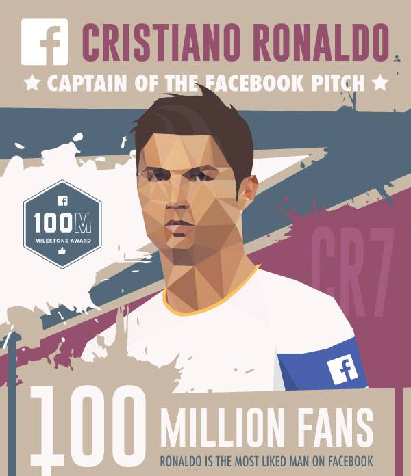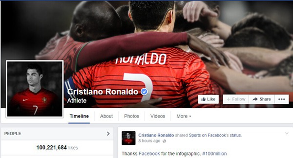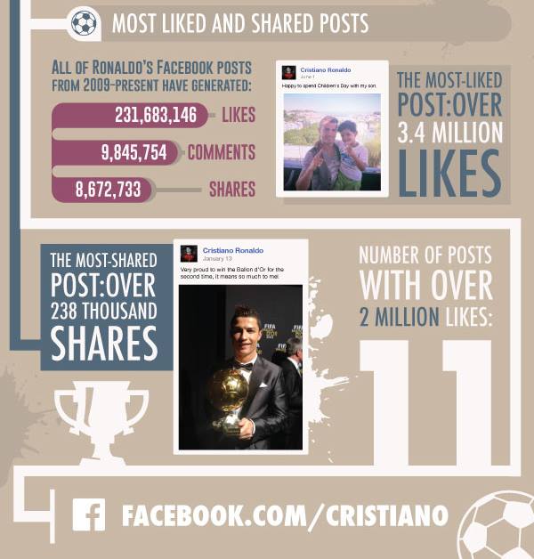 C罗首次在Facebook上发贴是在2009年,5年来,他的帖子总共赢得了2.3亿个赞,吸引粉丝发表984万条评论,分享867万次。他赢得球迷赞数最多的一个信息是他与儿子的合影,共有340万球迷点赞。而他第二次捧起金球奖奖杯的照片,吸引球迷做出23.8万次分享,被点赞200万次。