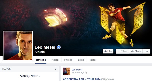 2.梅西(巴塞罗那俱乐部):7397万Facebook粉丝