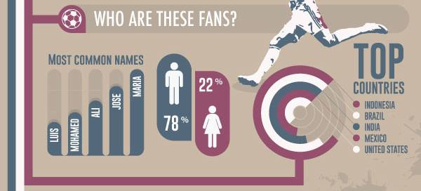 他的粉丝78%是男性,但粉丝中最常见的名字是玛利亚(Maria),粉丝最多来自印度尼西亚。